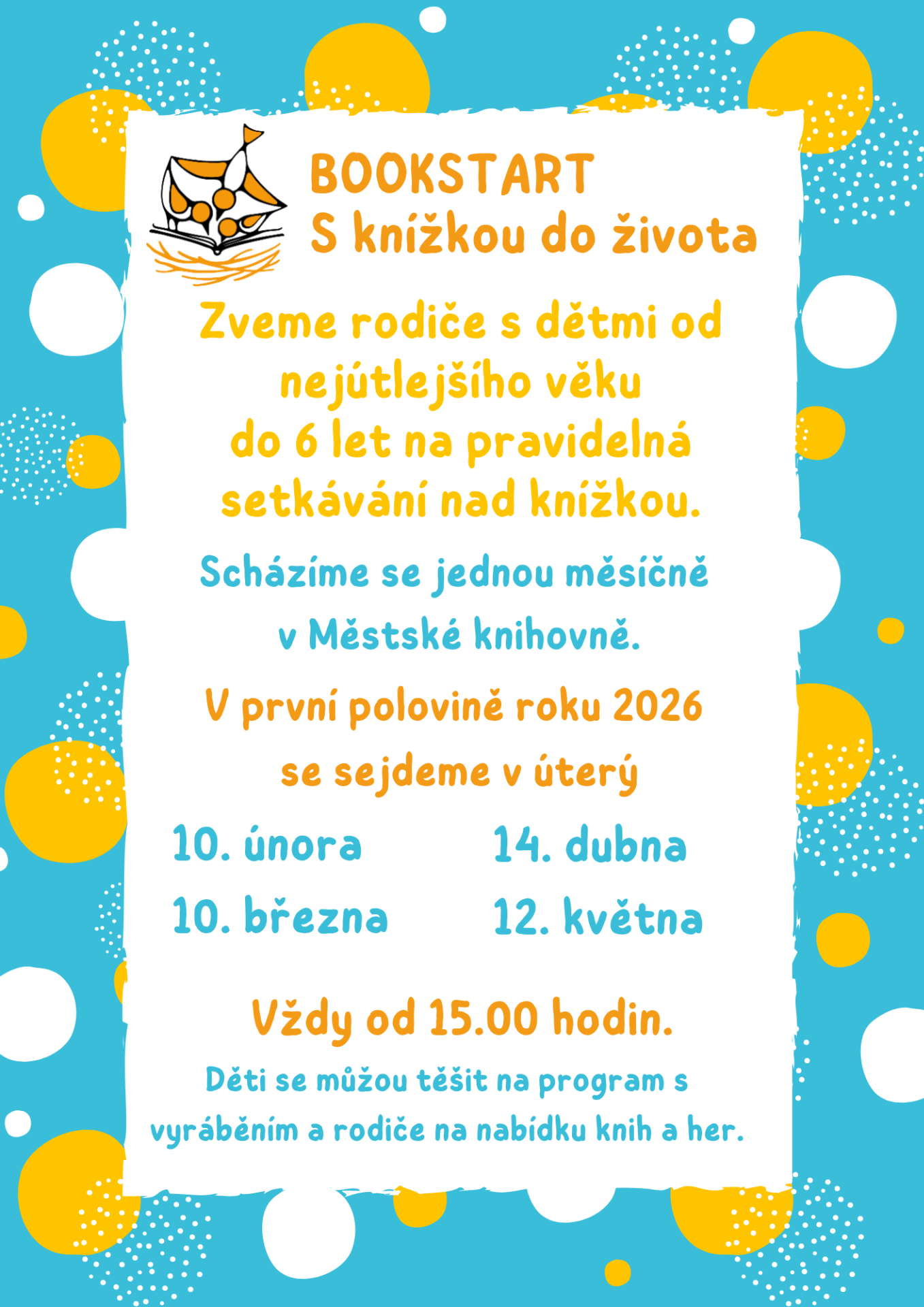 Milí rodiče, milé děti, srdečně vás zveme na setkání v rámci programu Bookstart – S knížkou do života, které je určeno pro nejmenší děti a jejich rodiče. Čeká vás příjemné odpoledne plné společného čtení, her a objevování světa knih.